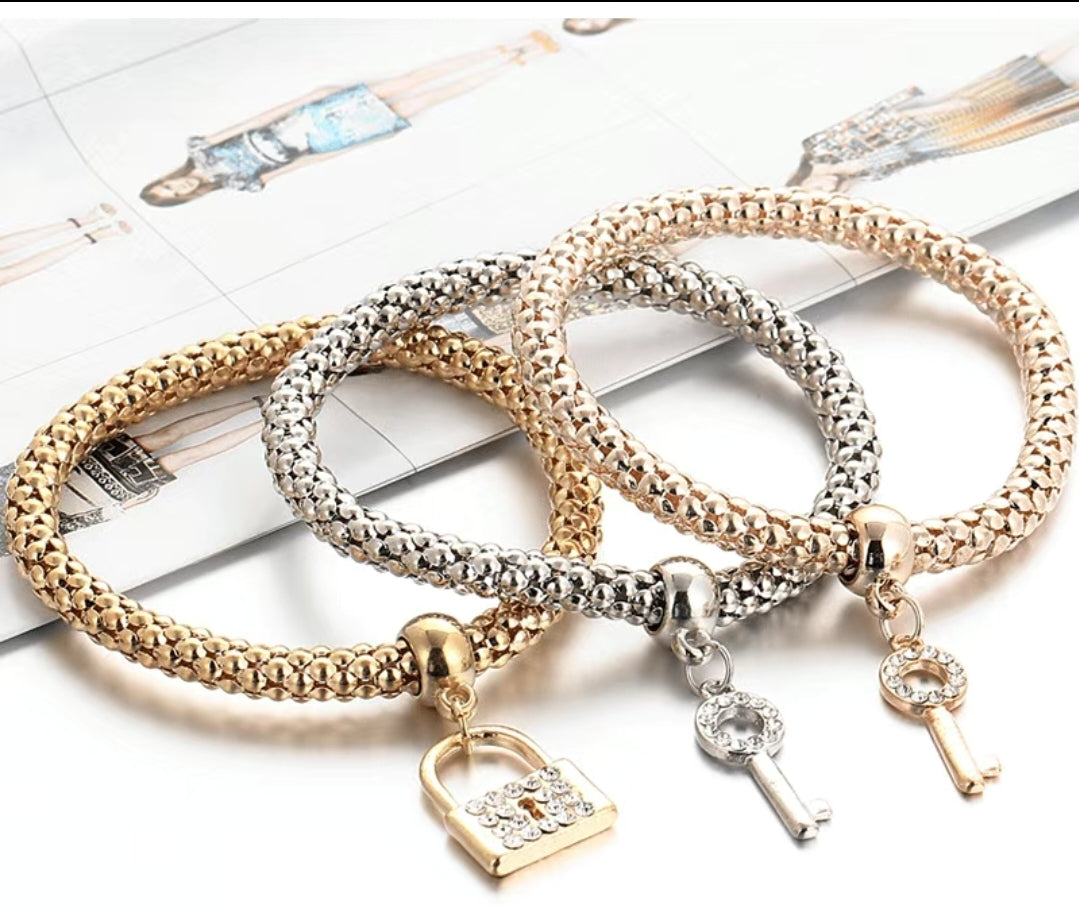 3pcs Stackable Bracelet Set With Lock & Key Shape Pendant|Stretch Bracelet